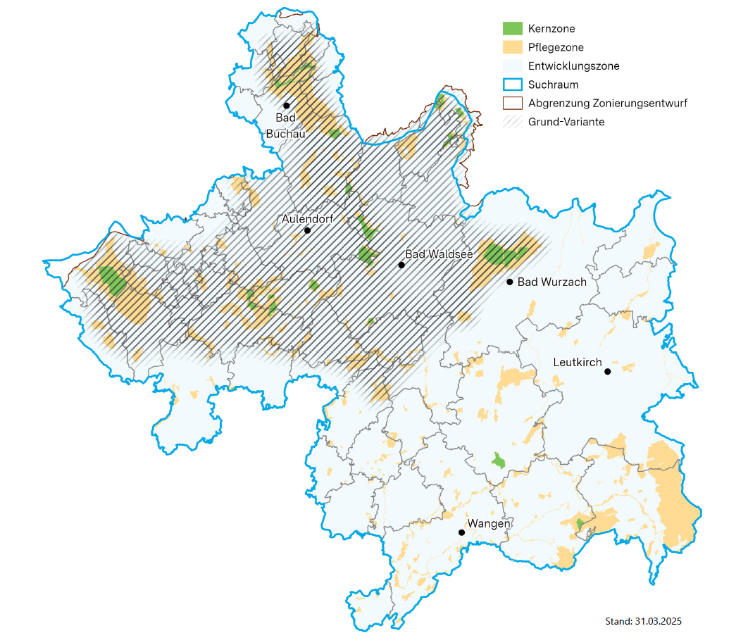 Der Suchraum erstreckt sich südlich davon bis Wangen/Achberg und Isny im Landkreis Ravensburg. Im Westen werden auch die Gemeinden Bad Saulgau, Illmensee und Ostrach im Landkreis Sigmaringen einbezogen.